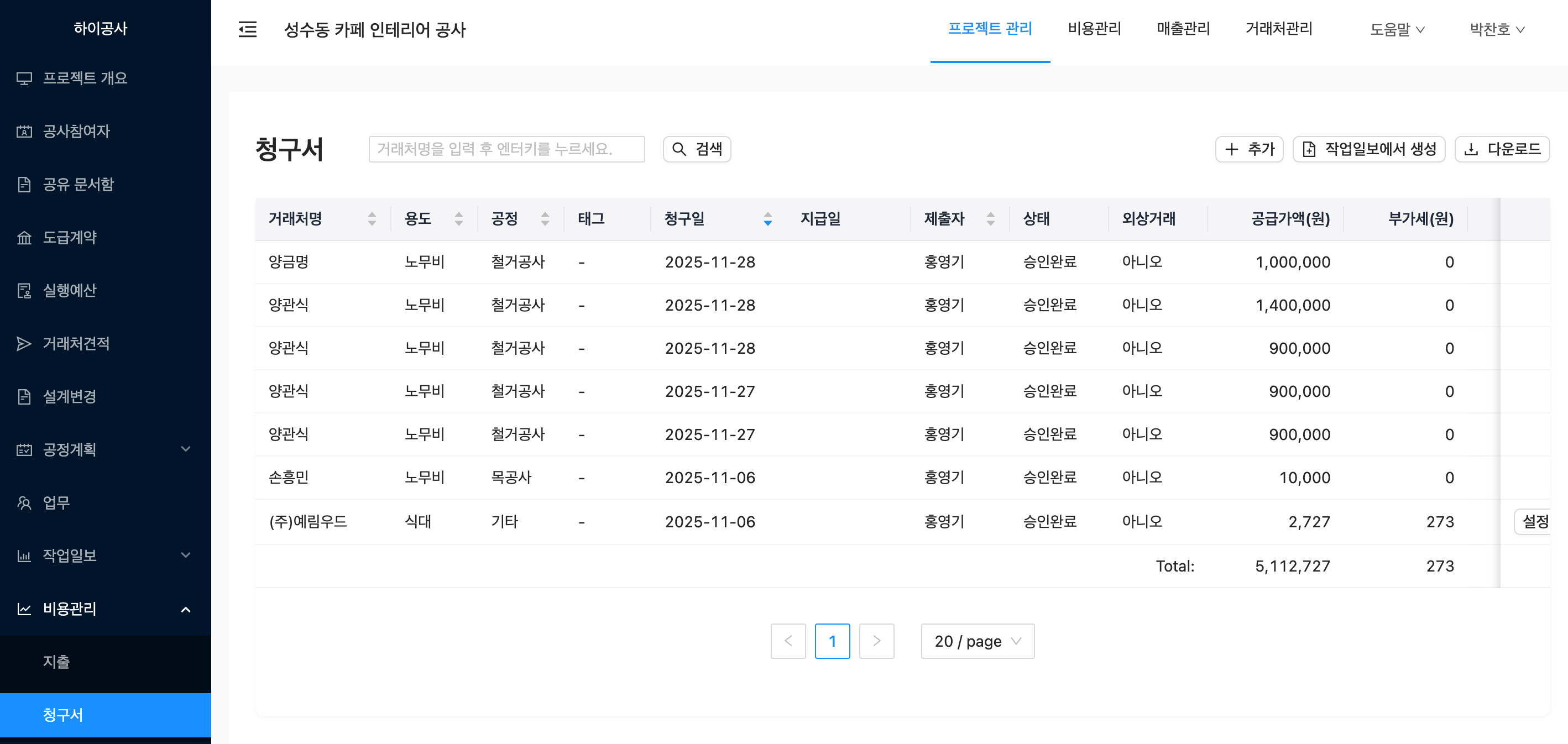 프로젝트 관리 > 비용관리 > 청구서 로 이동