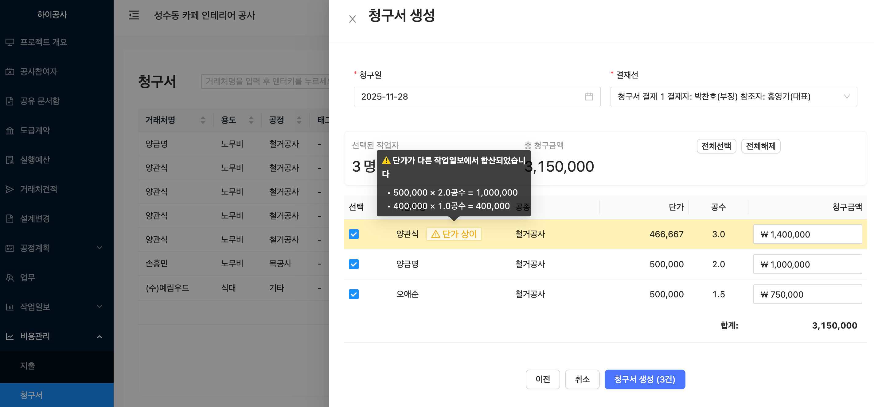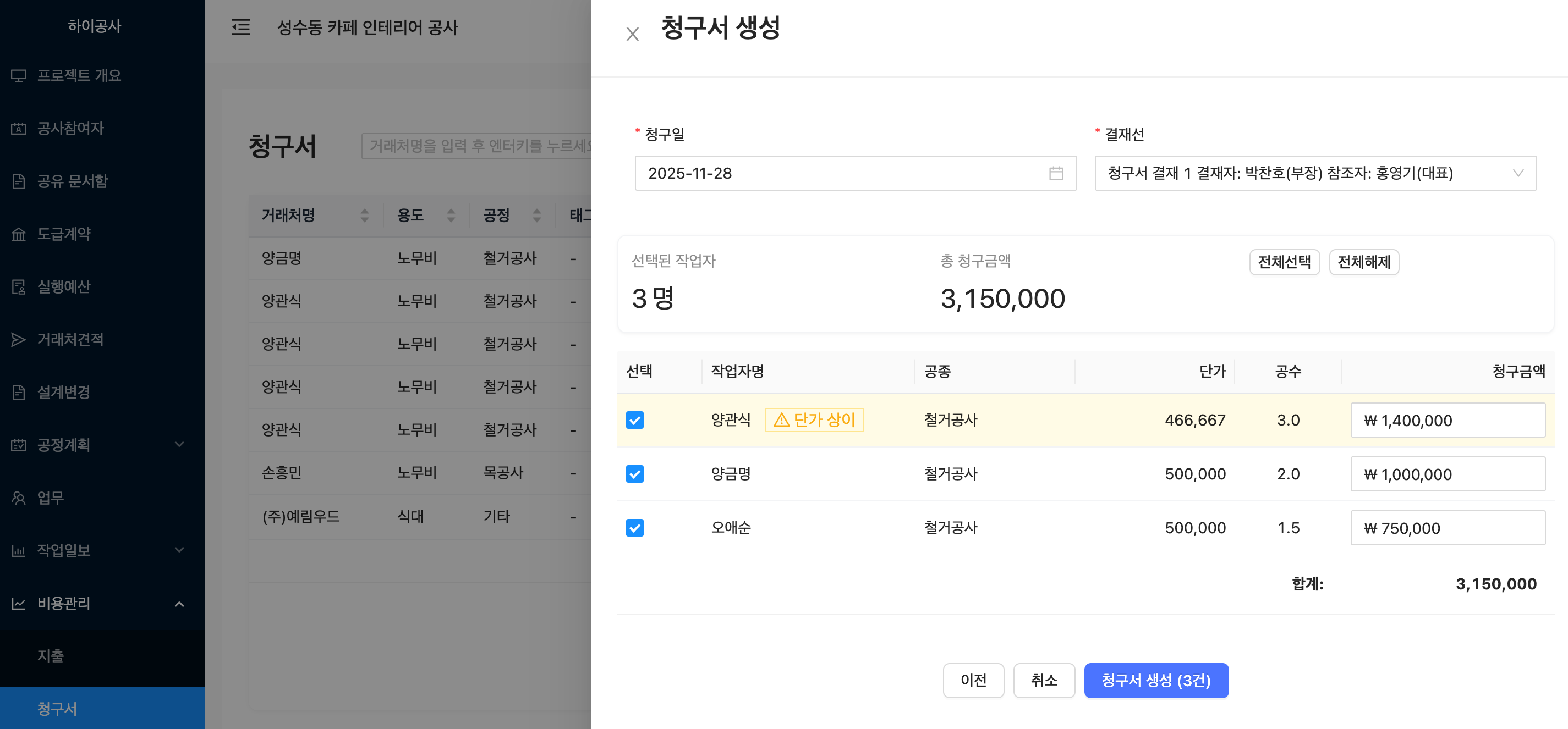 청구일, 결재선, 작업자 선택 후 하단에 있는 "청구서 생성" 버튼 클릭