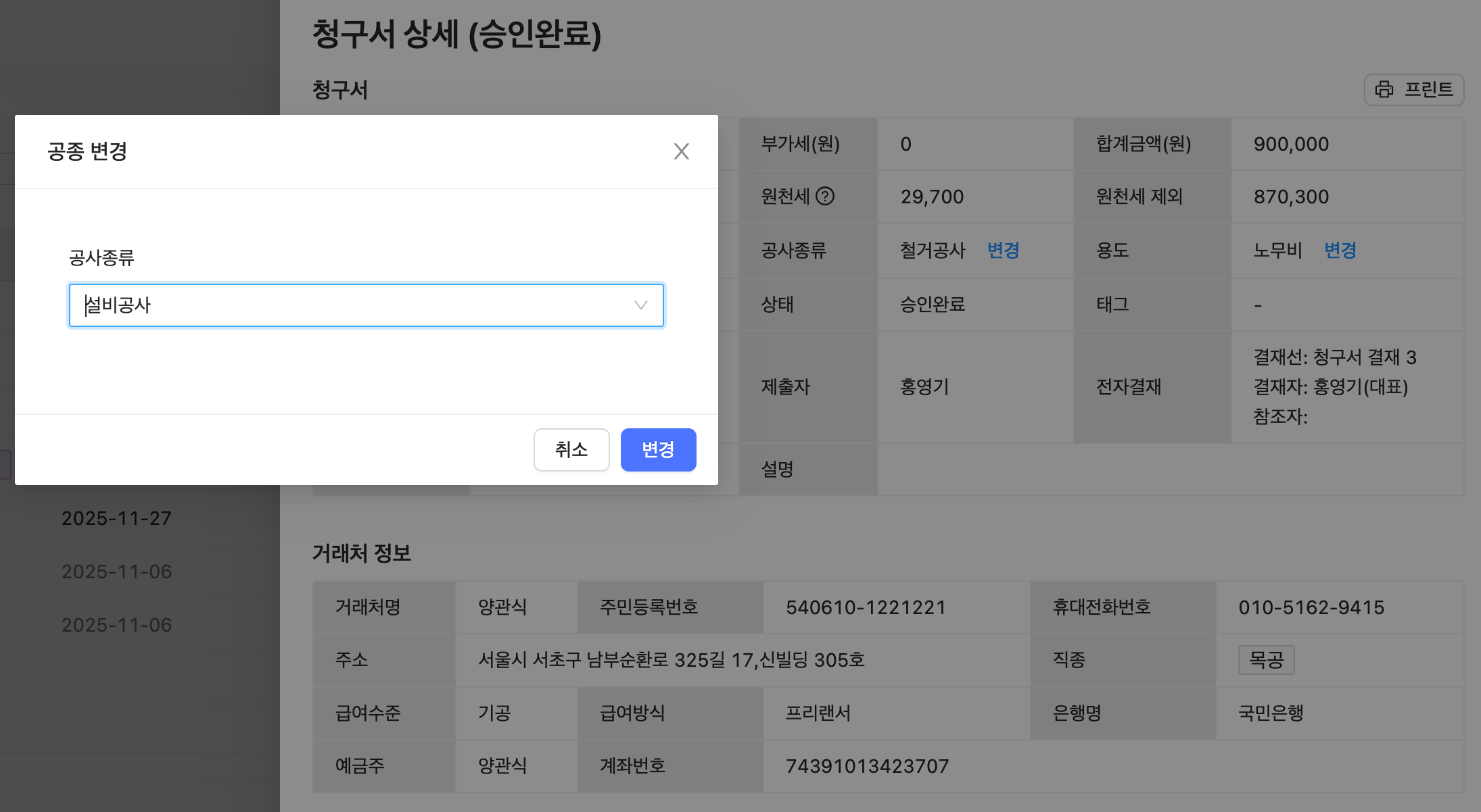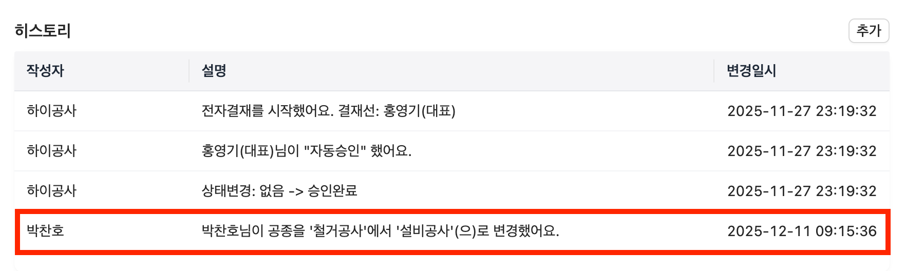조건청구서 상태승인완료, 지급완료사용자 권한청구서 작성자프로젝트에 참여중인 관리자, 매니저사용 방법PC웹 에서 청구서 상세화면으로 이동공사종류 또는 용도 옆에 있는 '변경' 버튼 클릭하여 항목 정보 변경하단의 히스토리에 변경 정보 추가됨