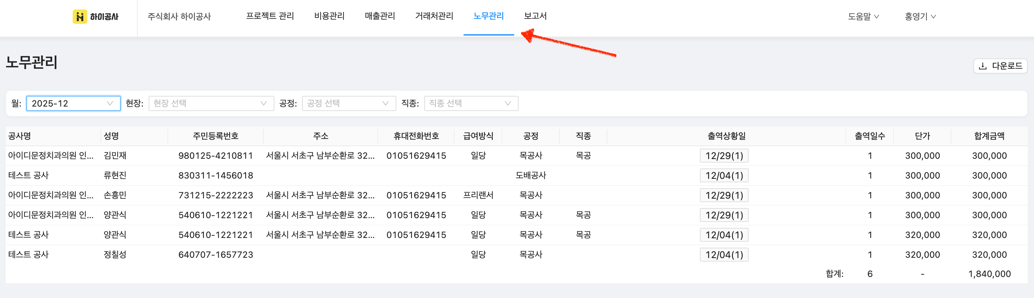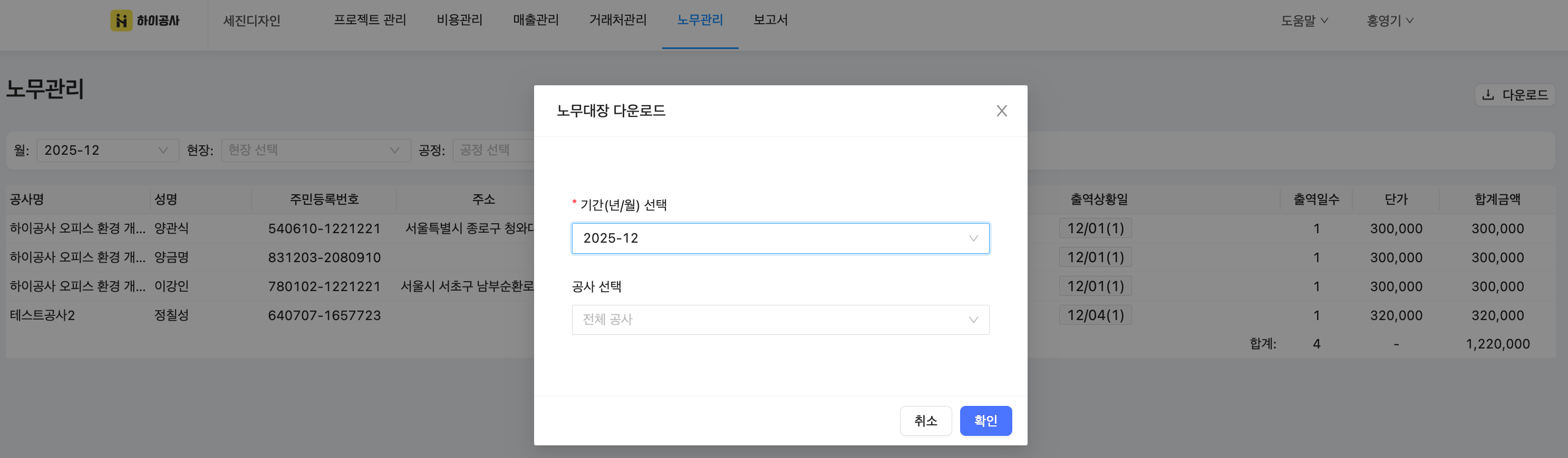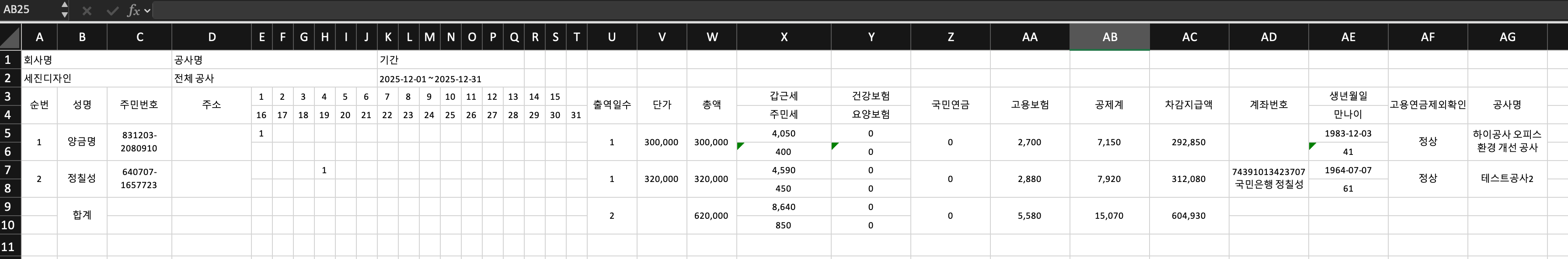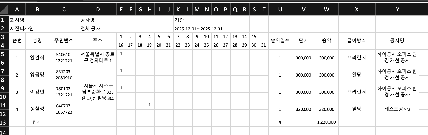 엑셀 파일 형태로 노무대장과 출역현황을 다운로드
