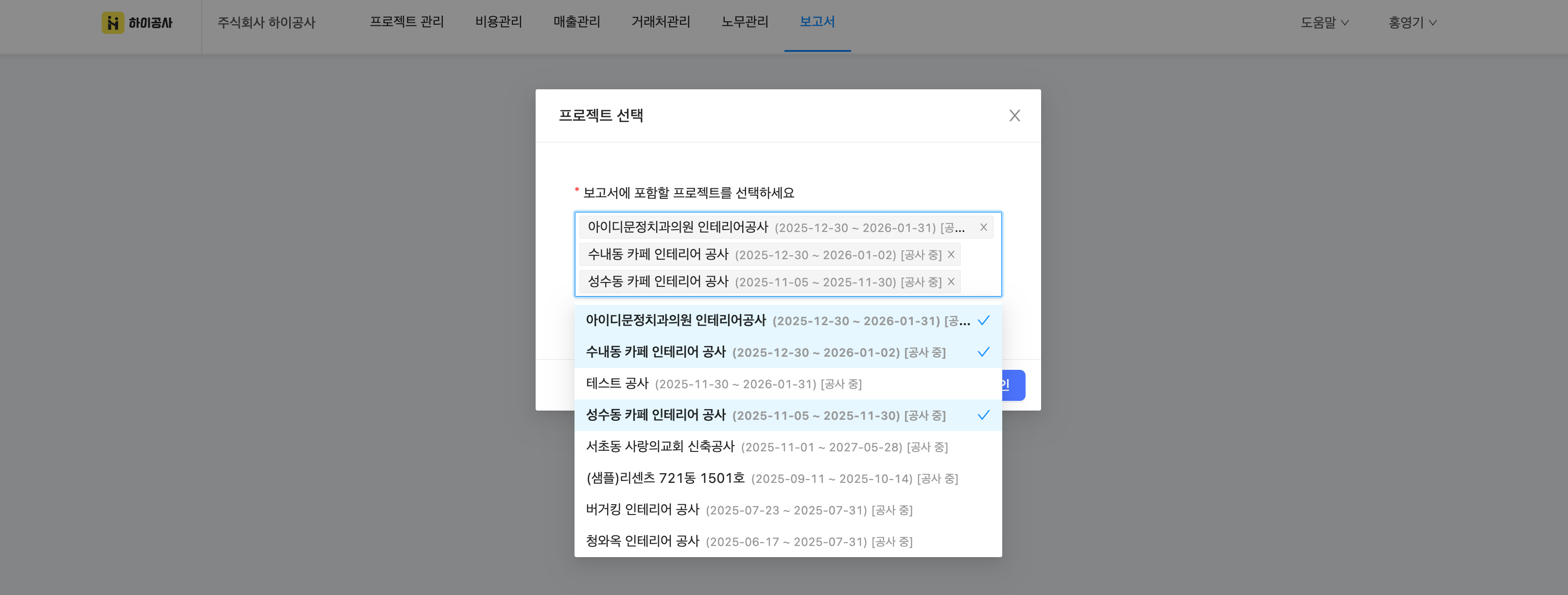 프로젝트 선택(1개 이상 선택 가능) 후 확인 버튼 클릭