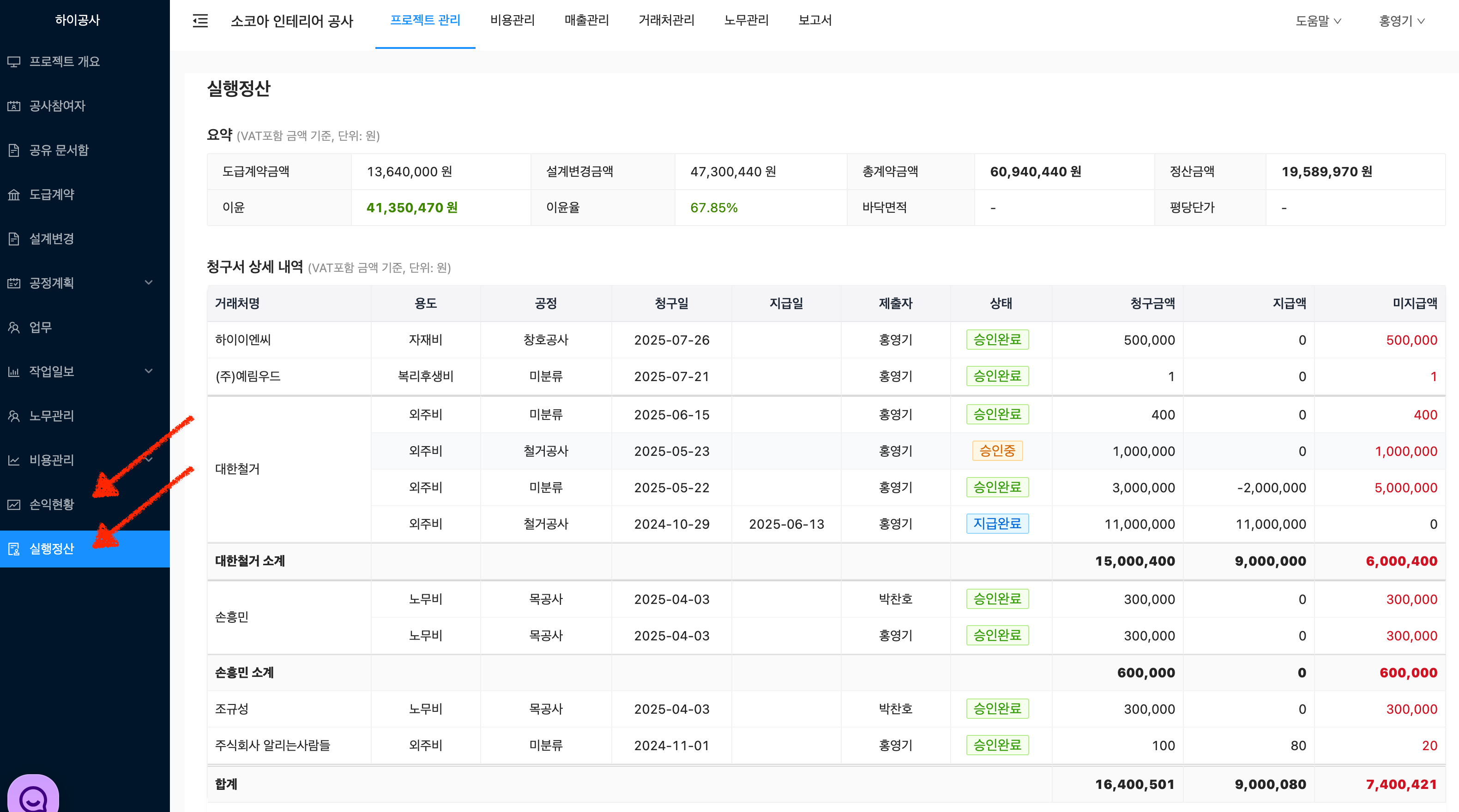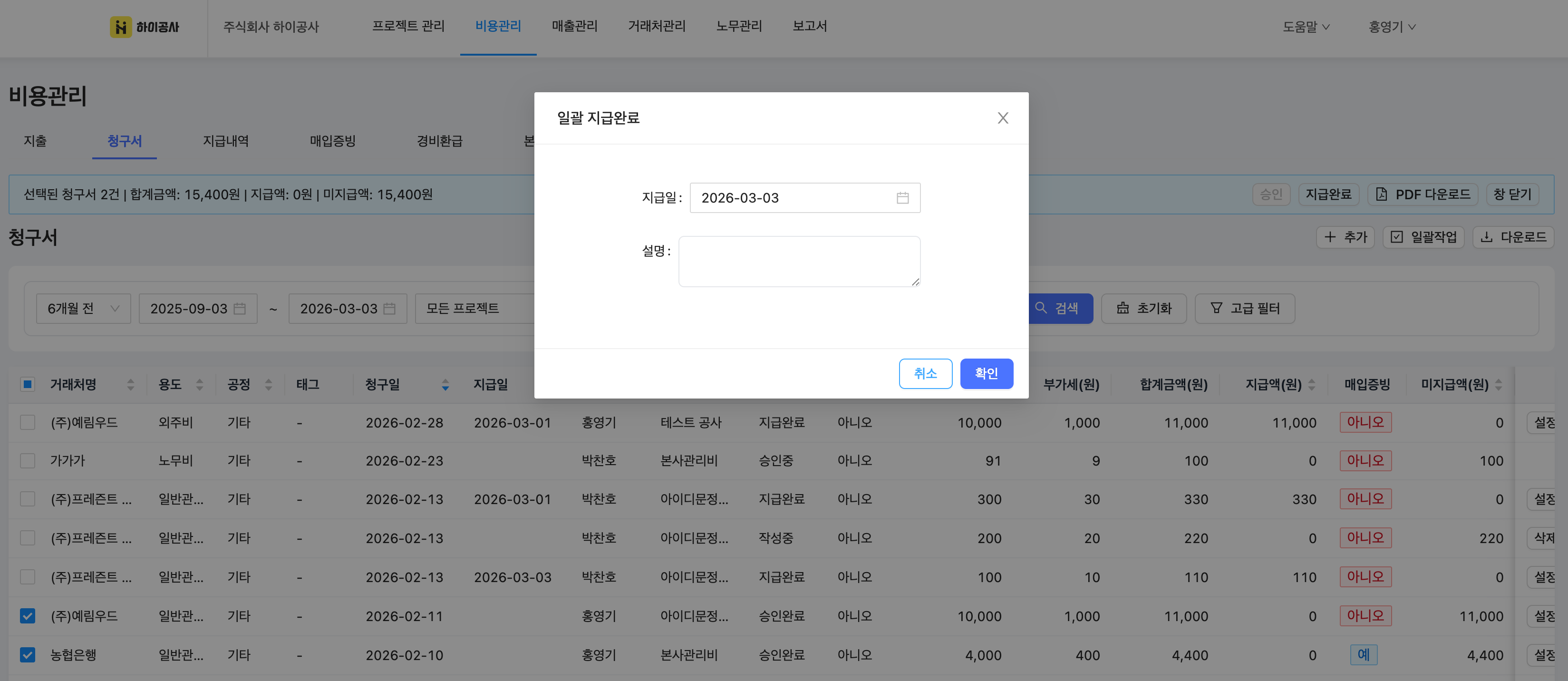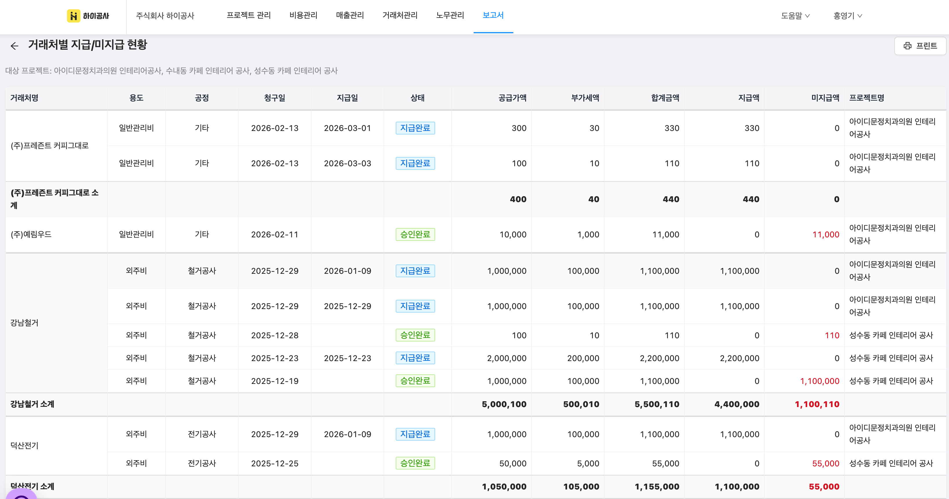 여러 프로젝트에 참여중인 거래처의 지급/미지급 현황 확인 가능